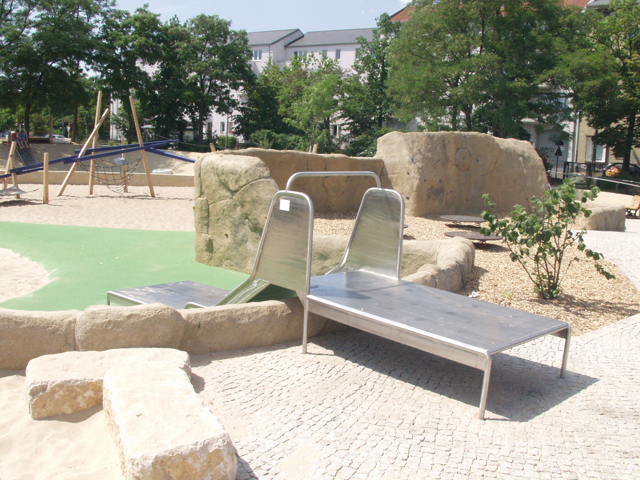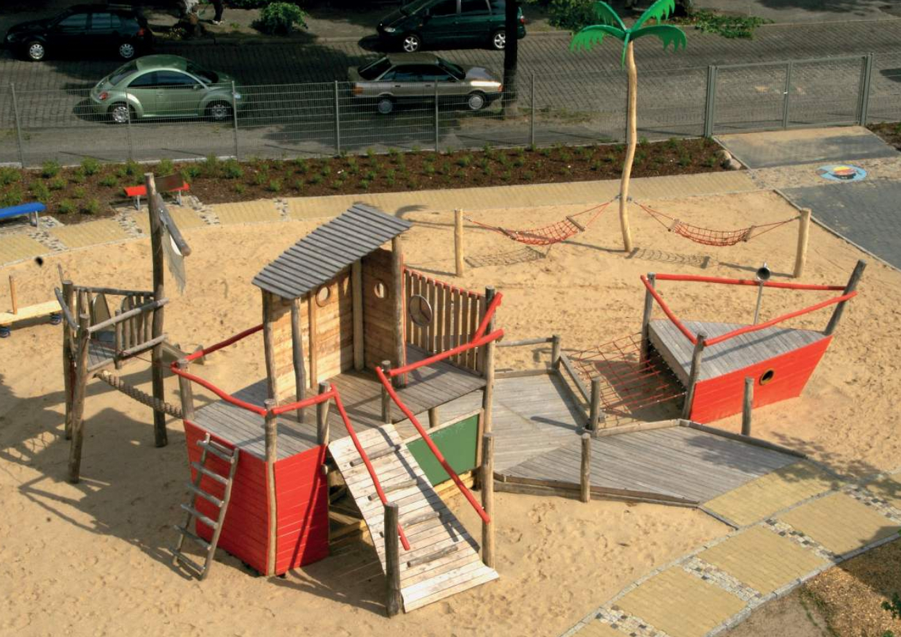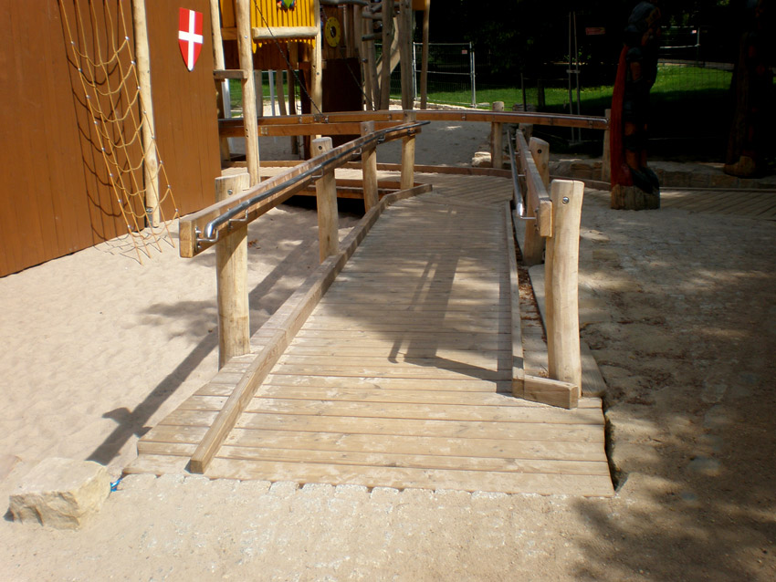 Grâce à ces aménagements, les enfants en chaise roulante ont eux aussi la possibilité de jouer avec de sable en restant dans leur fauteuil, mais aussi de circuler tout en passant sur des obstacles variés, grimper, glisser…