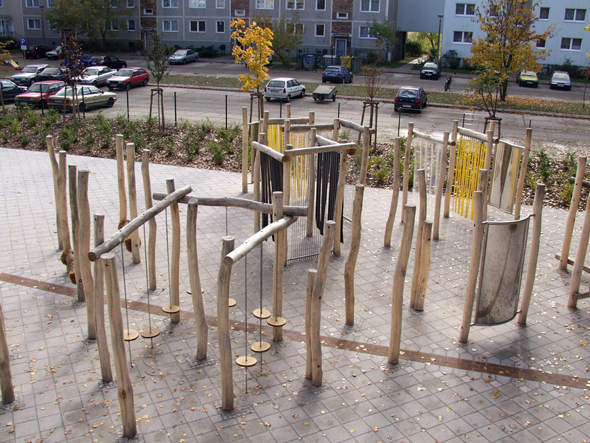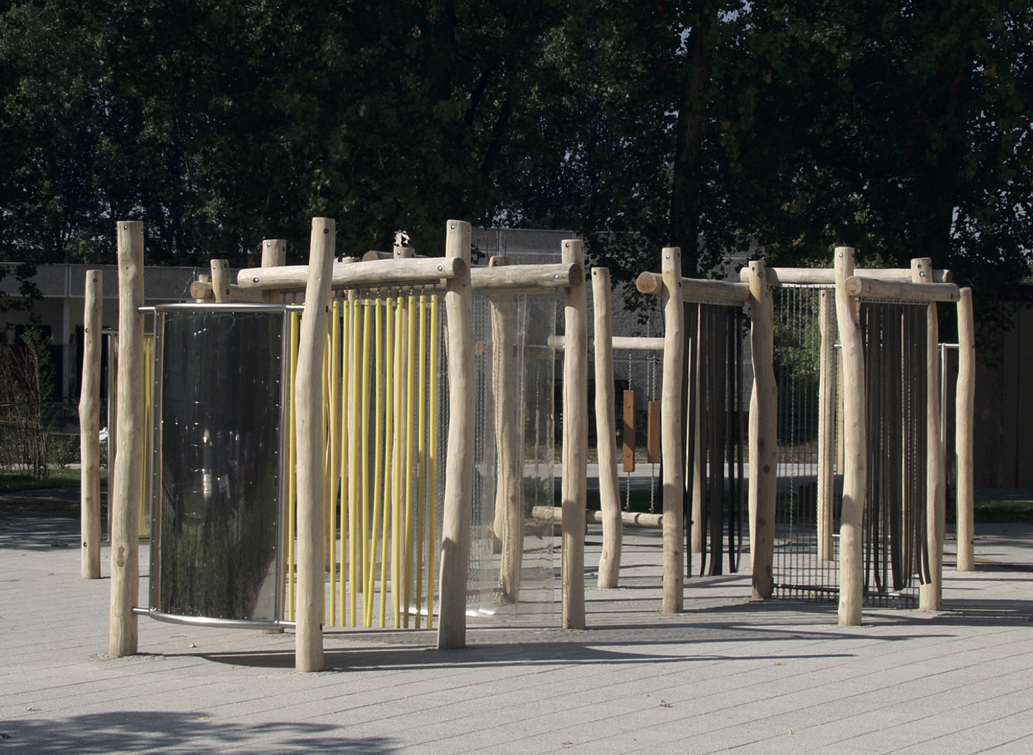 Divers éléments permettent à chacun d’y trouver son compte : bordures et canisses pour guider les enfants déficients visuels jusqu’aux structures, mobilier adapté, modules sonores, parcours multi-sensoriels…